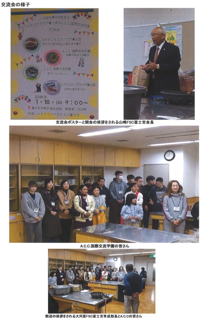 ふじさんシニアクラブ富士宮と富士宮市にある日本語学校A.C.C.国際交流学園生徒さんたちの「お国自慢料理」での交流会が令和8年1月18日(日)富士宮市総合福祉会館で行われた。笑顔あふれる楽しい交流会でした。おじいちゃん・おばあちゃんたちが積極的に国際交流をするなんて素敵ですね。