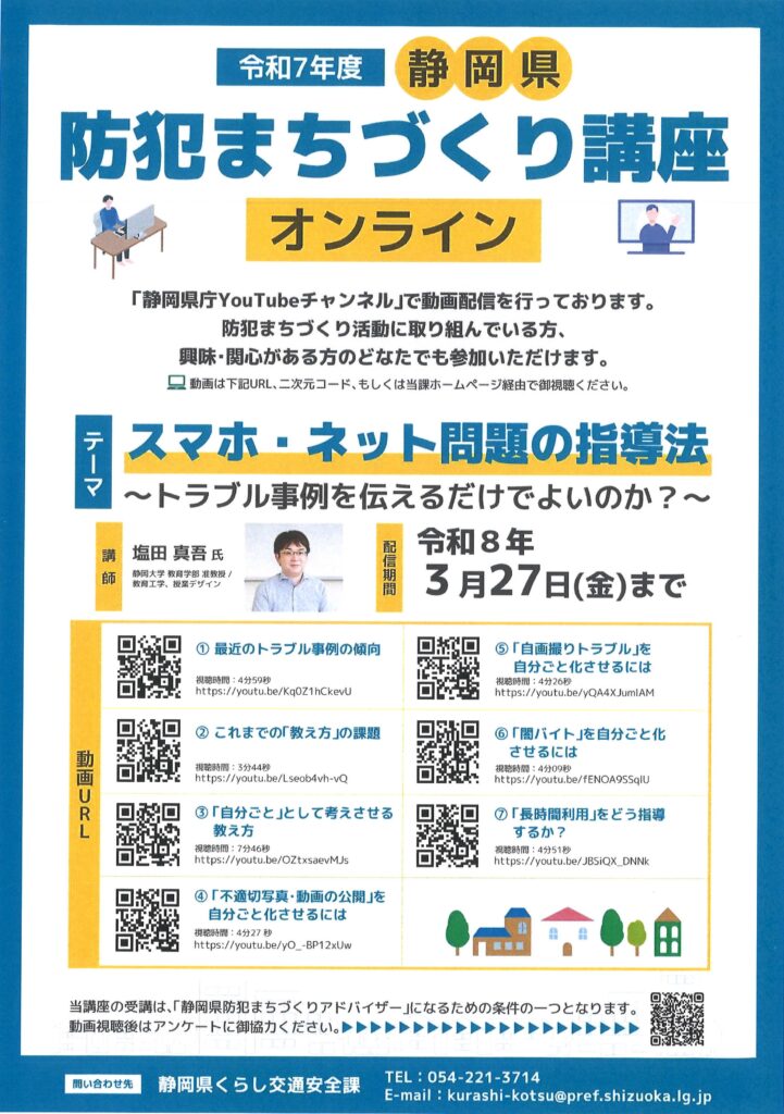 「令和7年度防犯まちづくり講座」(オンライン)のお配信のお知らせ。                               テーマ:「スマホ・ネット問題の指導法」